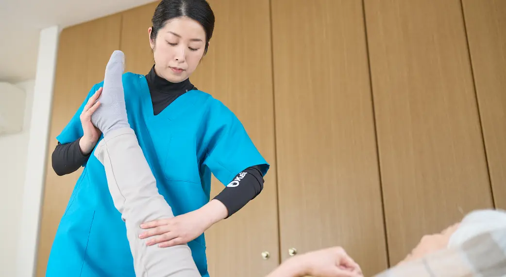 ご利用者様のご自宅や介護施設に伺って施術を行います。対象者は外出や歩行が困難な方でほぼ後期高齢者になります。1日の訪問件数は平均7~8件。ご利用者様お一人おひとりの異なる疾患や傷病、生活環境に向き合い、治療だけでなく、笑顔溢れる在宅生活を支えられることを目指しています。